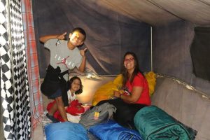 Fomos pro acampamento, que já tinham barracas enormes armadas, com sacos de dormir e tecidos térmicos. Cada barraca cabia 2 famílias… a amizade é estimulada imensamente a ideia é todos se misturarem sem qualquer distinção.