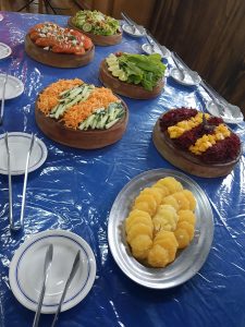 A hora da refeição (aliás as horas, pois comemos muitoooo e muitooooo bem são 5 refeições diárias, deliciosamente desenvolvidas e preparadas com imenso carinho e cuidado) é outro momento maravilhoso. Em um gigante refeitório de mesas compartilhadas, todos fazem tudo… colocam, tiram, limpam a mesa. Se servem nos réchauds sozinhos e as crianças acabam comendo muitooooo bem. Com direito a saladas orgânicas colhida no próprio local e um cardápio incrivelmente variado. Com direito a músicas antes e depois , agradecimento pelo alimento.